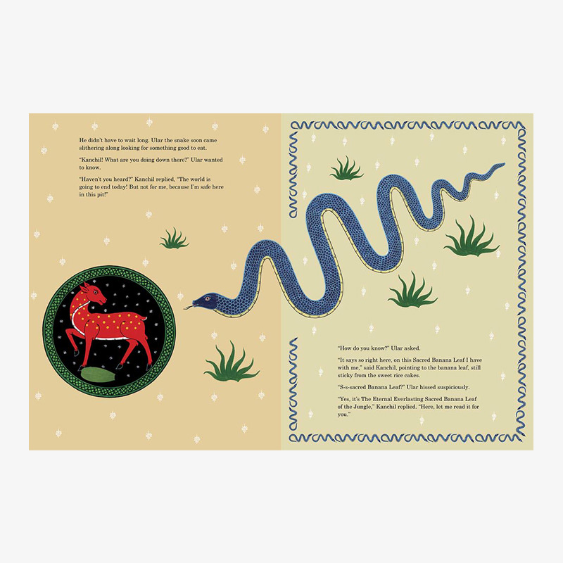 'The Sacred Banana Leaf' by Nathan Kumar Scott is a trickster tale that features Kanchil, a mouse deer. Kanchil lazily trots through the forest, engrossed in his favorite rice cake got from the Sunday market. He accidentally falls into a deep pit which was too slippery for him to climb. After a few failed attempts, he quickly devises a plot by turning the wrapper (Banana leaf) of the rice cake sacred.