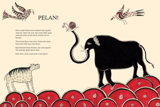 The highlights of The Great Race are the illustrations by Jagdish Chitara, a traditional artist of the Waghari group. This group actually does textile block printing in the exquisite 'Mata Ni Pachedi' style with natural dyes, representing Mother Goddess and the stories and myths around her. The colors used are mainly blood red, black and white. These traditional images exclusively contained for textiles were brought into contemporary forms in the book, while also retaining it's integrity and essence!