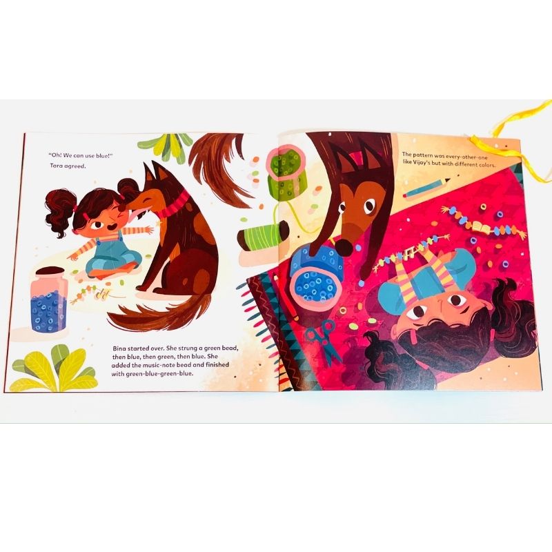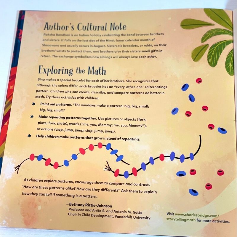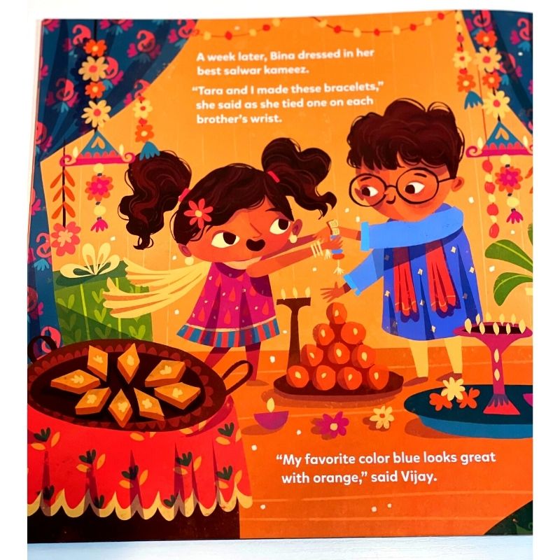 For the Hindu holiday of Raksha Bandhan, Bina is determined to make beaded bracelets for her brothers all by herself. She finds out which colors her brothers like and dislike and sets to work. Working with her every-other-one beading pattern causes Bina to discover something new about patterns--and her brothers.