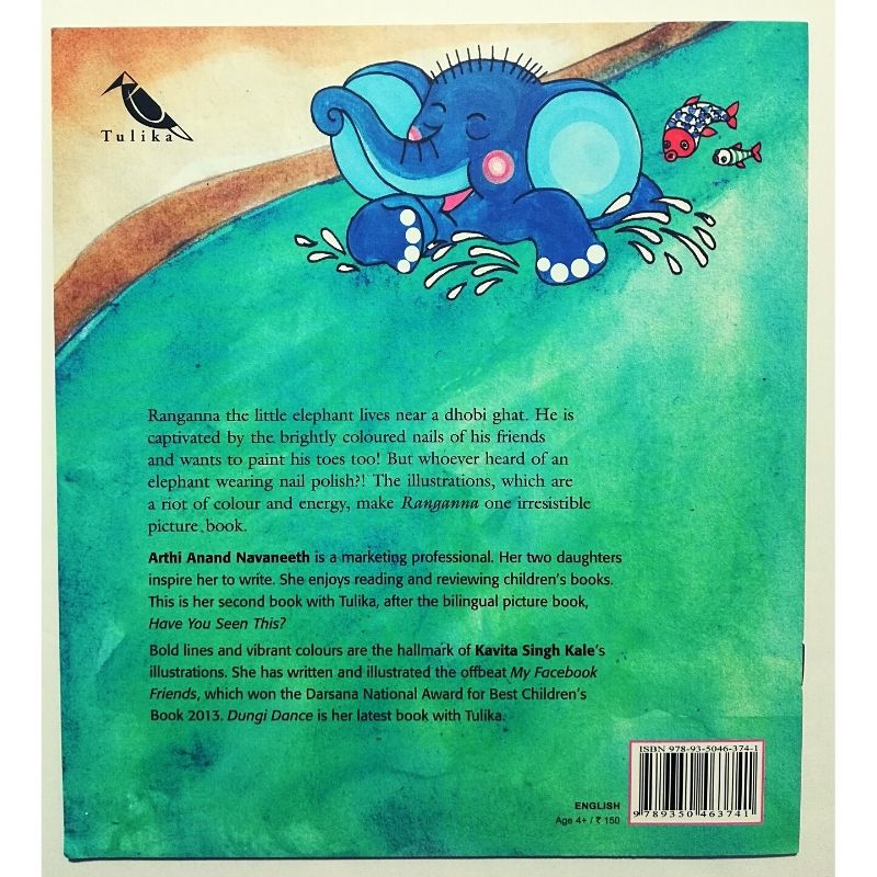 Ranganna is the story of a cute little elephant who loves colours. He lives by the temple, near a Dhobi Ghat right next to a flowing river and loves to see the colours in everything. Whether it’s the clothes the Dhobis hang out or the wonderful flowers sold near the temple. His two friends, Aditi and Anushka, come up to him one day with nail polish on their nails. And the colour crazy Ranganna is so fascinated by the colours on their nails, that he asks for nail polish on his nails too. Whether Ranganna gets his nails polished and what does he do later on, is what the book is all about.