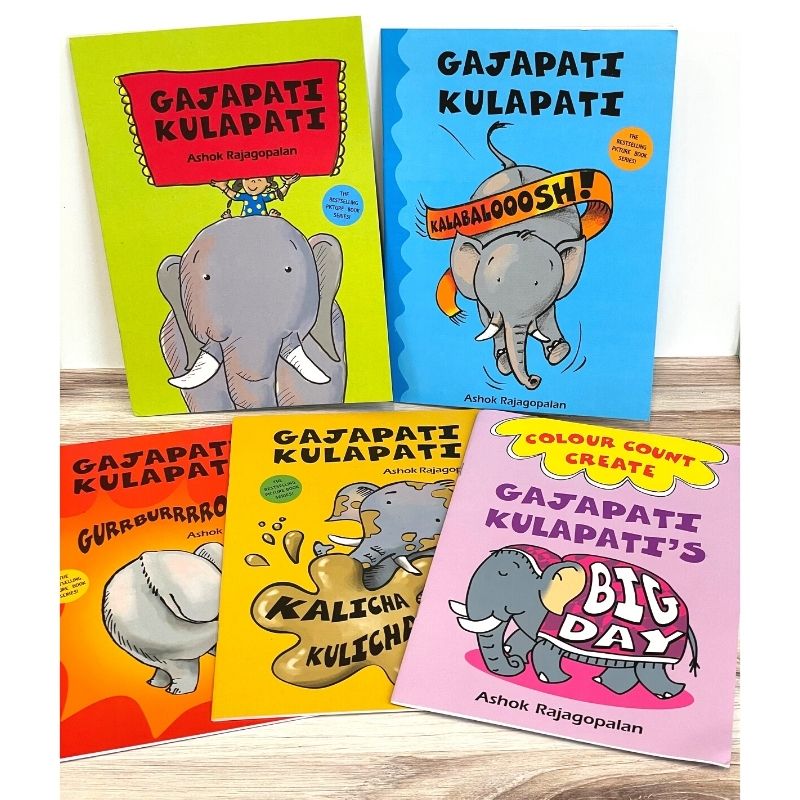Get the whole set! Five books from the hugely popular and much-loved Gajapati Kulapati series by renowned children's writer and illustrator, Ashok Rajagopalan! Tulika's picture books on the adorable elephant named Gajapati were huge hits ever since the first picture book came out in 2008. Get all five books in one bundle! The second book, 'Gajapati Kulapati Kalabaloosh!' The third, 'Gajapati Kulapati Gurrburrrrooom,' and the fourth, the brand new 'Gajapati Kulapati, Kalicha Kulicha!' and of course, the brand new 'Gajapati Kulapati's Big Day - Colour, Count, Create'
