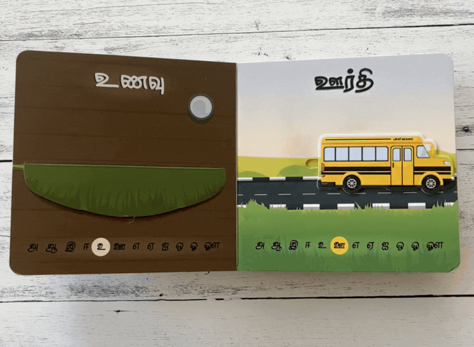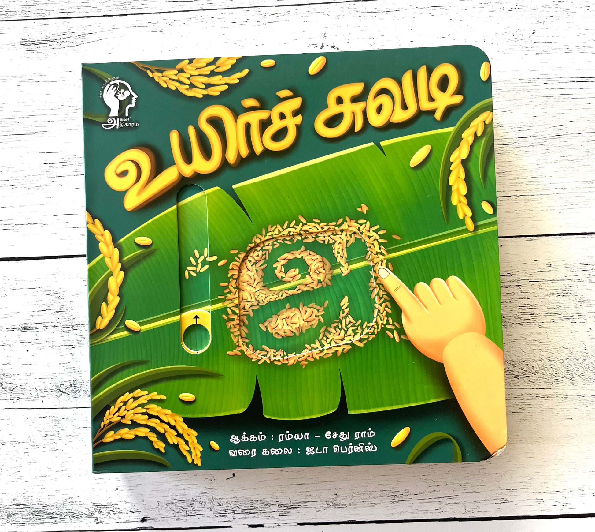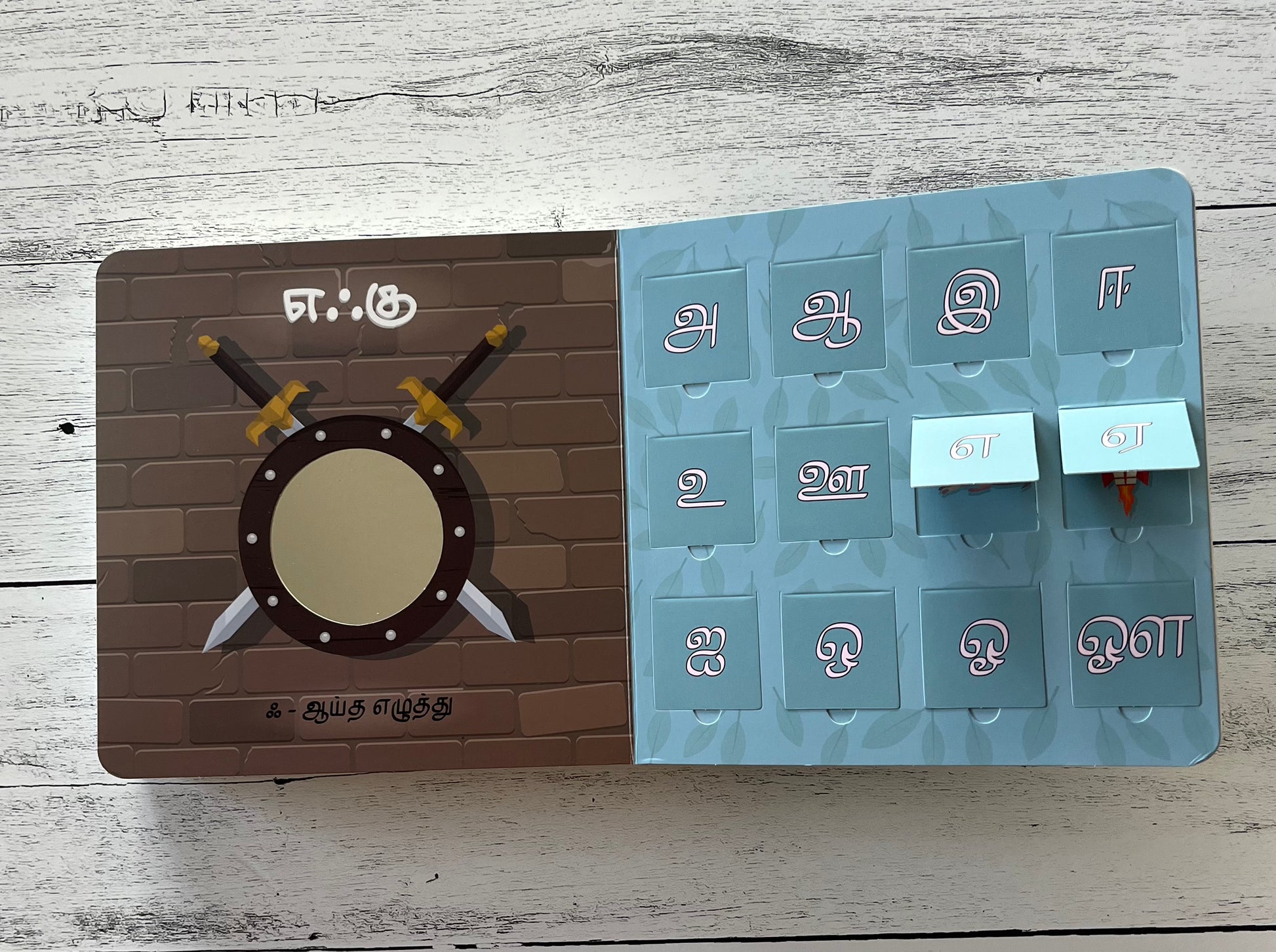 Introduce your child to the Tamil vowels with 'Uyir chuvadi,' the first Tamil interactive book designed specifically for young learners. This book incorporates a variety of engaging interactive elements, including sliding parts, touch-and-feel textures, push-and-pull tabs, and lift-the-flap features, making learning both fun and immersive. It is an excellent tool for early alphabet recognition and sensory development.