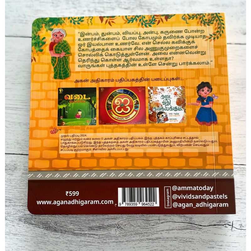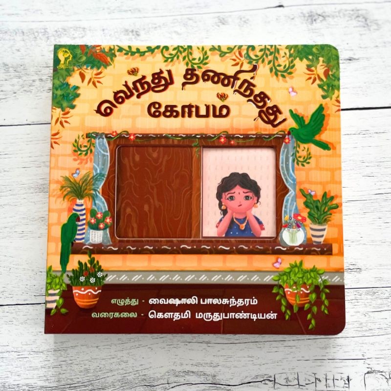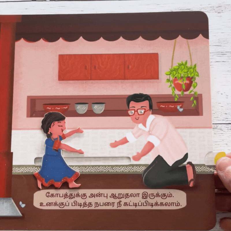 Children's interactive book in Tamil for emotional regulation. The book features unique interactive elements like sliders, flaps, cloth, and wheels.
