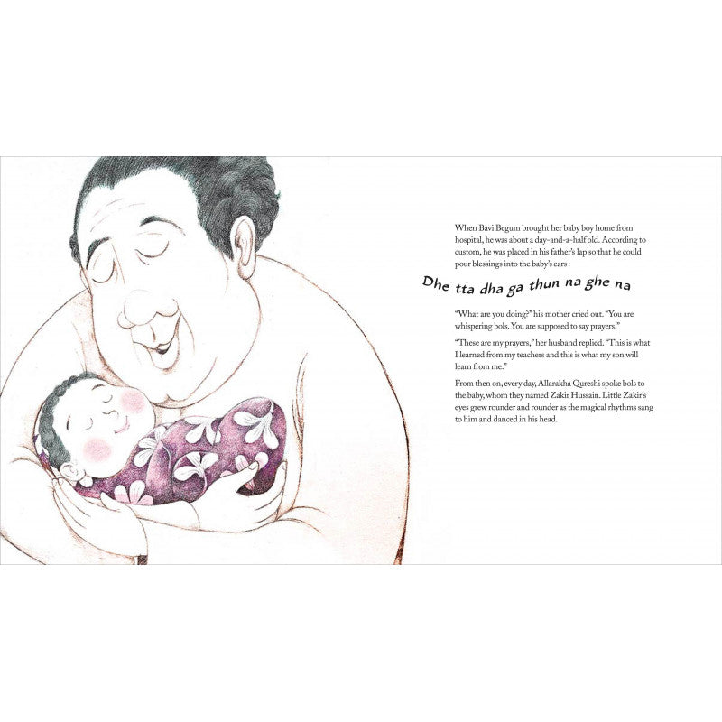 Just a day and a half old, the very first words Zakir hears from his famous father, Allarakha, are bols — rhythms played out on tablas! From then on, rhythms sing and dance in his head, on Amma’s cheeks, on the pots and pans in the kitchen…