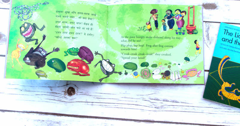 The old snake is punished — but the frogs had better watch out! An unusual telling, which swings sympathy in favour of the snake. Stunning pictures are based on Channapatna wooden toys.