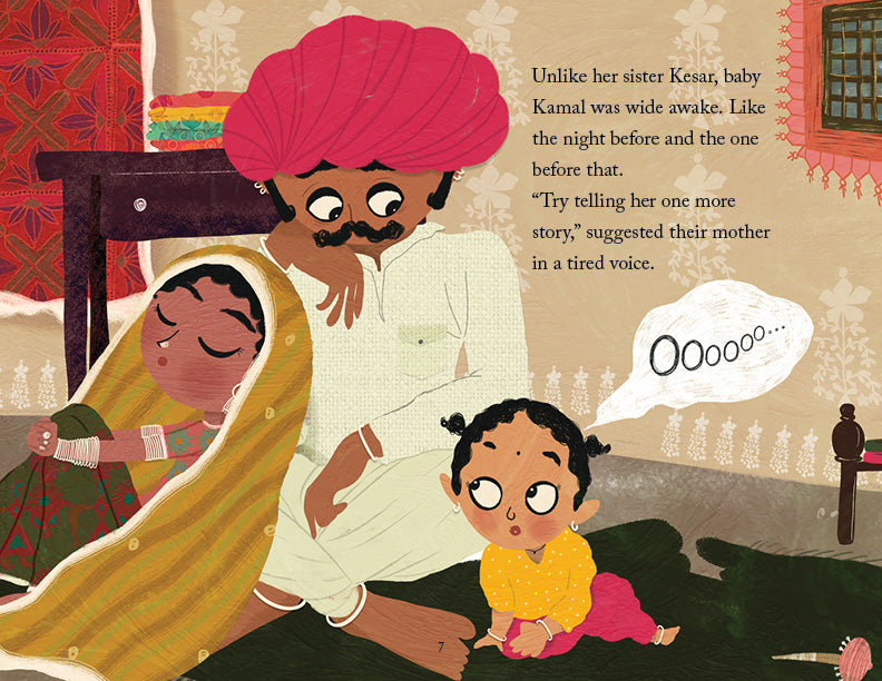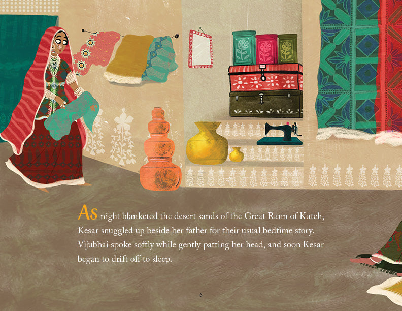Kesar’s baby sister Kamal will not sleep. Their entire village in the Great Rann of Kutch is kept awake by the infant’s cries and her parents are exhausted. When Kesar and Kamal’s ba comes to visit, her stories give Kesar a wonderful idea. Perhaps what Kesar needs to put her baby sister to sleep is a little bit of desert magic!
